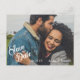 Der weiße Text sagt "Save the Date" am unteren verlass dieser Verlobung Ankündigung und Save the Date Postkarte. Direkt rechts befinden sich zwei benutzerdefinierte Textfelder für das wichtige Datum und Ihre Namen. Der Text überlagert Ihr eigenes Foto. Auf der Rückseite der Postkarte befinden sich mehrere zusätzliche Textfelder. Einfach, aber funktioniert sehr gut mit vielen Fotos.