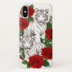 Das Bild zeigt zwei majestätische weiße Tiger, die inmitten lebendiger rote Rosen aufgestellt sind. Die Tiger mit ihren auffallenden Pelzmustern strahlen ein Gefühl von Gnade und Power aus. Die üppig grünen Blätter, die die Blume umgeben, verstärken den lebhaften Kontrast und schaffen eine harmonische Mischung aus Naturschönheiten. Die Gesamtkomposition ist dynamisch, wobei die Tiger wachsam und postiert erscheinen, während die Rose eine romantische Touch hinzufügen, was die Szene visuell faszinierend macht.