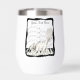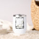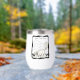 Ce buveur est muni d'un chat blanc qui se balade sur les touches de piano avec des barres de notes de musique ondulées sur la partition dans un cadre noir ondulé avec des points blancs. Customisez votre texte avec le modèle.