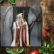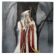 Ein Zauberer ganz in weiß, rot und gold hält ein Team mit beiden Händen mit einem sehr alten großen Eichenbaum hinter sich und einem Wald um sich herum. Hinter den Schultern des Zauberers steckt ein schwarzer Rabe.