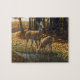 Ein weißes Tier beobachtet ihre sechsmonatige Fawn, während es aus einem Bach trinkt. Herbstfarben gibt es überall in den Ahornbäumen des umliegenden Waldes, was der Szene ein warmes und gemütliches orangefarbenes Glühen verleiht. Realistisches Kunstwerk aus einem originalen Ölgemälde des Pferd- und Wildtierkünstlers Crista S. Forest.