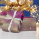 Abstrakter Hintergrund mit strahlenden Lichtstrahlen in rosa und lila Farbtönen, verstreut mit vergoldeten Konfetti und funkelnden Sternen.