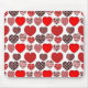 Dieses Mauspad hat ein Valentinisches Design von sich wiederholenden Herzen mit verschiedenen Grafiken in einem Feld von weiß.