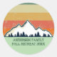 Cooler Aufkleber für Wiedersehen-Party für eine Herbstveranstaltung mit Cousins, Tanten, Onkeln und Großeltern. Laden Sie die ganze Crew mit Ihrem Nachnamen und Jahr in Grün ein, um das wunderschöne Sonnenuntergang über Bergen und Bäumen zu umgeben. Großartiges personalisiertes Gruppenreisedesign für Camping.