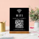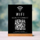 Modernes schwarzes Acrylzeichen, das Ihren Kunden, Kunden oder Gästen eine einfache Verbindung zu Ihrem WiFi-Netzwerk ermöglicht. Laden Sie den QR-Code Ihres WLANs hoch und fügen Sie alle weiteren Details hinzu, wie den Namen und das Kennwort des Netzwerks in einfacher weißer Typografie. Ideal für Büros, Hotels, Ferienwohnungen, usw.