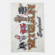 Die Sehenswürdigkeiten und die Ikonen von Wigan, in größerem Manchester, in England, stylised Cartooncharakters seiner Exporte und townscape, einschließlich (von links nach rechts) NordSoulaufzeichnung, Transport für größeres Manchester-Zeichen für Wigan (TfGM) Wallgate Bahnhof (mit Wigan Athletic Schal), eines Onkel Joes Mint Ball, der Orwell Pub kennzeichnend Versionen eines an Wigan Pier hörend Wigans Piermusik und schließlich an einem Stagecoachbus Nr. 32 mit Wigan Kriegerschal und an berühmter Wigan Torte. Wigan wird heraus im traditionellen roten Ziegelstein und im Sandstein, mit BaumwollBlumenverschönerung buchstabiert.