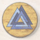 Ein geschickter Getränk-Untersetzer, der den klassischen Valknut Entwurf über schön verwittertem hölzernem Wikinger-Schildhintergrund kennzeichnet.