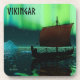 Ein leicht stilisiertes Bild eines Viking-Langschiffs, das nachts unter den Nordlichter segelt, gibt es einige Eisberge; die meiste Crew schläft. Text liest "VIKINGAR" (Wikings) wird ebenfalls angezeigt.