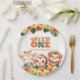 Geschlechtsneutrale "Wild one" 1. Geburtstag Party Papier Teller mit einem niedlichen Löwen, Giraffe und Affen umgeben von grünen Blätter und orange und gelb tropischen Blume. Personalisieren Sie Ihre persönlichen Daten mit dem Namen Ihres Kindes.