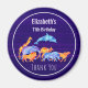 Ein Dankeschön Magnet mit einem digitalen Aquarellbild einer Herde wilder Tiere, die zusammen laufen. Zu den Tieren zählen ein springender Delphin, eine Giraffe, Elefant, Känguru, Nashorn, Löwe und Leopard. Set auf lila Hintergrund.
