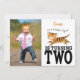 La vie est bonne quand vous avez deux ans ! Famille Invitation et amis pour célébrer notre fête de deuxième anniversaire de petits tigres. Un joli et adorable tigre de jungle sauvage est prêt à passer un bon moment !. La typographie moderne avec le nom de votre fils ou fille. Ajoutez une photo préférée de votre petit tigre. Idéal pour des événements safari, jungle ou zoo.