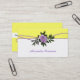 Lila, gelbe, weiße, florale Visitenkarte mit einer wunderschönen, wilden Rose lila mit dunkelgrünen Blätter, lila gewellten Linien und einem halbgelben Hintergrund. Elegantes, einzigartiges Design, perfekt für den persönlichen oder beruflichen Gebrauch.