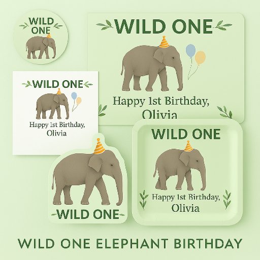A sweet Wild One birthday accent featuring a gentle elephant wearing a party hat on a soft light‑green background. Leafy details frame the “Wild One” heading above, while cheerful balloons highlight the birthday name below. This design is created for first birthday safari and jungle themes and adds a playful touch to any celebration. The name shown is just an example — you can use the personalization tool to change the birthday child’s name and make it your own.
