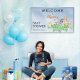 Niedliches "Welcome" Tiersafari-Design für Ihre Babydusche. Im Grünen ist ein üppiger Dschungelmotiv mit einem blauen Himmelshintergrund und Safaritieren (Elefanten, Leopardenbecher, Löwenbecher, Zebra und Giraffe) stehend. Composite Design von Holiday Hearts Designs (Rechte vorbehalten).