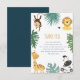 Wilde Tiere Themenkarte für eine Babydusche. Text und Farben können personalisiert sein.