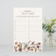 Dieses Wildblume Baby Shower Game verbindet Eleganz und Charme. Die handbemalten Wildblumen in den Farben Bordeaux, Gold, Creme und Violett, die von üppiger Vegetation unterstrichen werden. Diese Blumen sind für jede Jahreszeit geeignet und in einem herrlichen Seitenstrauß angeordnet, das ein modernes und frisches Ambiente verleiht. Mit einem Bordeaux-Muster auf der Rückseite bietet diese Spielkarte Vielseitigkeit und Eleganz und macht sie zu einer unterhaltsamen und stilvollen Unterhaltung für Ihre Baby-Duschgäste.