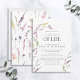 Eine wunderschöne, elegante Aquarell-Wildblume mit Blumen und handgeschriebenen Kalligrafien Feier des Lebens Gedenkfeier Service Einladung. Text ist leicht personalisiert. Copyright Anastasia Surridge für Elegant Invites, alle Rechte vorbehalten.