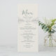 Elegantes Hochzeitsmenü, Boho, Wildblume, botanisches, schlängelgrünes Hochzeitsmenü mit Silberseilherz und Vintag vergoldeter Blumenspitze.