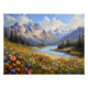 Ein atemberaubendes Alpental, in dem sich eine lebendige Wiese von Wildblumen in Richtung eines kristallklaren Flusses erstreckt. Hochwertige, schneebedeckte Berge umrahmen die Szene unter einem strahlend blauen Himmel und schaffen eine ruhige und malerische Landschaft voller Farbe und Ruhe.