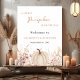 Ein Begrüßungspposter für eine Babydusche. Ein weißer Hintergrund. Die Einrichtung besteht aus Wildblumen in Beige, Rosa und Kürbis. Personalisieren und fügen Sie den Namen der Mutter-zu-sein und das Datum.