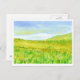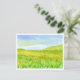 Eine hübsche Postkarte mit einer hügeligen Landschaft, bedeckt mit Wildblumen, die sich mit Präriegras unter einem zarten, blauen Babyhimmel in Aquarellfarbe vermischen. Sie können die Postkarte an Ihre Bedürfnisse anpassen.
