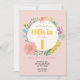 Feiern Sie den ersten Geburtstag Ihres kleinen Mädchens mit diesem wunderschönen Aquarellkranz auf Rosa mit einem sonnigen, gelben Retro-Schriftart.