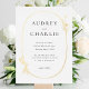 Ein elegantes Hochzeitsdesign mit schwarzer Typografie auf einem knusprigen, weißen Hintergrund, umgeben von einem zarten ovalen Kranz in der Wildblume. Der Kranz ist aus einer Vielzahl von Wildblumen in Goldfolie gefertigt und schafft so einen sanften und romantischen Look. Die Typografie ist elegant und raffiniert, mit einem klassischen Serif-Schriftart, der den Charme der Einladung noch verstärkt. Die Kombination aus dem fett schwarzen Text und dem zarten Kranz der Wildblume schafft einen atemberaubenden visuellen Kontrast und macht diese Einladung zu einer schönen Wahl für eine feierliche Hochzeitsfeier. Der saubere, weiße Hintergrund ermöglicht es den anderen Designelementen, sich zu erheben und die Einladung leicht zu lesen, sodass Ihre Gäste keine Schwierigkeiten haben werden, alle wichtigen Details über Ihren großen Tag zu finden.