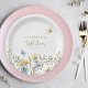 Delikate Wildblumen Wiesenbouquet und Schmetterlinge mit pastellfarbenen Aquarellblüten elegante Frühling oder Sommergarten Liebe in blühenden Brautparty personalisierte Papier Teller mit whimsical elegante moderne Kalligraphie Drehbuch über einen weißen Hintergrund.