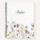 Dieses Design ist eine hübsche weibliche Wahl in Notizbüchern und bietet eine Reihe von Aquarellfarben-Wildblumen in sanften Pastelltönen in Rosa, Periwinkelblau, Gelb und Gelb mit zarten Stielen und Grünpflanzen. Eine Textvorlage wird zur Personalisierung mit Ihrem Namen und Monogramm Initial.