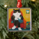 Tuxedokatze sitzt und Stricks im Ernst.