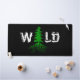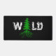 Man Liebe im Freien und hat wilde Wurzeln. Dieses Outdoorsdesign ist das Wort wild in einem Schriftart aus Holz mit einem Baum und Wurzeln.