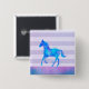 Ein Button mit einem hübschen Aquarellpferd in Blau und lila Farbtönen. Laufen wild und frei. Set auf einem horizontalen, lila gestreiften Hintergrund mit einem Vintagen Flair. Ein blau-rosa Wasserfarbenrand lag am Boden.