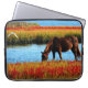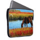 Schönes braunes wildes Pferd, das von einem blauen See mit einem bunten Grasteppich im Hintergrund und in einem Seemöwefliegen trinkt. Fantastische Naturlandschaft.
