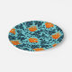 Teller in einem Vintagen William Morris Blumendamaske-Muster aus anemonischen Blume und Blätter, digital verbessert und farbig - tiefe indigoblaue Blätter und Blume in Korallenorange auf hellkambraunem Hintergrund
