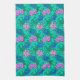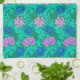 Küchenhandtuch in Vintager William Morris, Jugendstil, floraler Ausdruck stylisierter Chrysanthemen, digital verstärkt und farbig, in Weich- und Türkistönen, Ceruléblau, Violett / Lavendel, auf aquamarinem Pfau Hintergrund