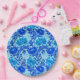 Papier Teller in einem Vintagen William Morris, Jugendstil, floraler Druck von stilisierten Chrysanthemen, digital verstärkt und farbig, in den Farbtönen Denim Blau und Tiefenindigo auf einem hellblauen und weißen Hintergrund