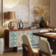 Für eine große Oberfläche wie Frisierer, Panzer, Tischplatten und ähnliche dekorative Möbel stehen uns mehrere Variationen dieser Collage zur Verfügung. Ideal für ein modernes Vintages Design Cotgcore Design ästhetisch. Hergestellt aus 4 Originalgemälden und Skizzen von William Morris mit einer wunderschönen botanischen Tulpenblumenillustrierung, einem bräunlichen und braunen ephemera-Stil-Blattwerk, sowie einigen teilweise bemalten Blumenmustern in aquamarinem, aqua-blauem Grün und Weiß. Diese wurden von Audrey Jeanne Roberts, einem international anerkannten Künstler und Designer, grafisch in eine komplexe Collage gestaltet.