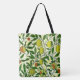 Gedruckte Tasche im William Morris Art Nouveau-Muster aus Zitronen, Granatapfelsen und Pfirsichen, mit Blüten, an grünen Zweigen - gelb und korallorange, mit grünen Blätter, mit gemustertem, gelb und weiß Hintergrund