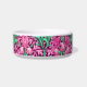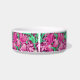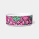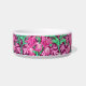 Pet-Schüssel in einem William Morris, Art Nouveau, Textil-Druck von Irises und Blätter, digital verstärkt und farbig, in Fuchsia und Eis rosa, Pfauengrün, und weiß, auf einem lila Hintergrund von Tiefwein