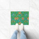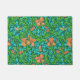 Doormat in einem William Morris, Art Nouveau, Textiliendruck von Irises und Blätter, digital verstärkt und farbig, in Mandarinenorange, Limonengrün und Weichaqua, auf einem tiefen, türkisfarbenen / aquamarinen Hintergrund