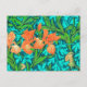 Postcard im William Morris, Art Nouveau, textiler Druck von Tischtennis und Blätter, digital verstärkt und farbig, in Orange, Kalkgrün und Weichaqua, auf türkisfarbenem Hintergrund