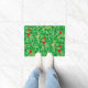 Doormat in einem William Morris Art Nouveau Textil-Muster von lycheischen Ästen und Blätter, in den Farbtönen Limon und tief grün, mit roten lychefrüchten und gelben Blüten, auf einem hellgrünen Hintergrund