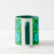Tasse in einem Vintagen William Morris Textilmuster aus stilisierten Blume und Blätter - Blume in tiefblauem bis hellblauem Farbverlauf, mit hellgrün grünen Blätter, auf tiefgrünem Smaragdgrün
