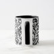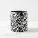 Tasse des Kaffees in einem Vintagen William-Morris-Damast-Muster von Blume und Blätter, schwarz, auf weißem Hintergrund, digital verbessert und farbig