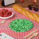 Papier Teller in einem William Morris Art Nouveau Textilmuster aus stilisierten Weidenzweigen und Blätter in den Schattierungen von tiefschimmerndem Jadegrün auf einem helljade grünen Hintergrund