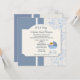 Eine stilvolle, blau-weiße Einladung mit winzigen Polka-Punkten, geschwungenen Köpfen, zarten Reben und einem dekorativen Paneel mit den Worten: "Es ist ein Junge!" und mit einem Babypeeking aus seinem Babywagen verziert.