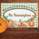 Herzlich willkommen in unserem Kürbispatchtext mit Ihrem Familiennamen gerahmt vor einem Kürbispflaster auf grünem Gingham-Hintergrund.