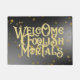 Die Dekoration im Außenbereich wird durch eine nach Maß gefertigte Türmatte ergänzt. Willkommen dumme Mortals Funny Zitat Skull Ghoulish Design Door Mat. Schwarz und Gold mit Gold Glitzer Confetti. Tolle Geschenkidee zu Halloween.