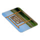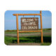 Ein Bild eines Staat-Line-Schildes mit Holzposten und einem blauen Himmel. Das ist hell und farbenfroh auf einem Magnet.