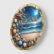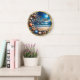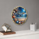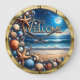 Diese runde Wanduhr präsentiert eine faszinierende mondbeleuchtete Strandszene. Der Vordergrund ist mit einer reichen Auswahl an irisierenden Muscheln, Perlen und Seestern geschmückt. Das Wort "WELCOME" ist aus goldenem, perlenbesticktem Schriftsatz erfunden. Hinter ihm ragen sanft mondbeleuchtete Wellen unter einem Sternenhimmel das Ufer, die alle in einem goldenen, gerippten Rahmen eingefasst sind.